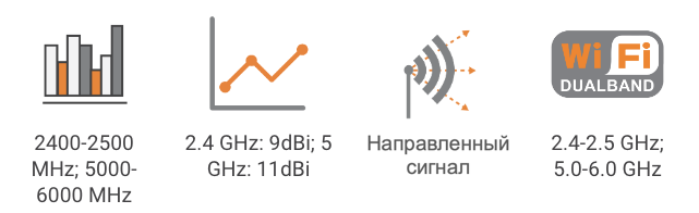 Широкая ширина луча обеспечивает хорошее покрытие в офисах на заводах и т. д. Антенна работает в двух частотных диапазонах Wi-Fi 2,4 ГГц и 5 ГГц, обеспечивая качественное использование радиочастотного спектра. Антенна имеет усиление 9 дБи в диапазоне 2,4 ГГц и усиление 11 дБи в диапазоне 5 ГГц, что обеспечивает наилучшую производительность при надежном соединении. Корпус изготовлен из ударопрочного АБС-пластика, устойчив к кислотам и другим химическим веществам, которые могут встречаться на промышленных предприятиях.